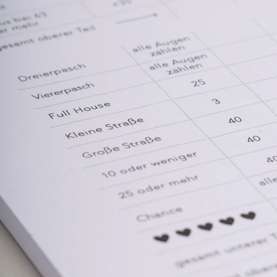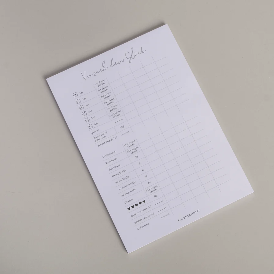 Liebst du es, dein Glück herauszufordern? Dann ist unser Versuch dein Glück Spielblock genau das Richtige für dich! Wir haben das klassische Kniffel-Spiel ein wenig umgestaltet und ihm unser einzigartiges Eulenschnitt Feeling verliehen. Perfekt für Spielabende oder ein kurzweiliges Match beim Kaffee-Date.