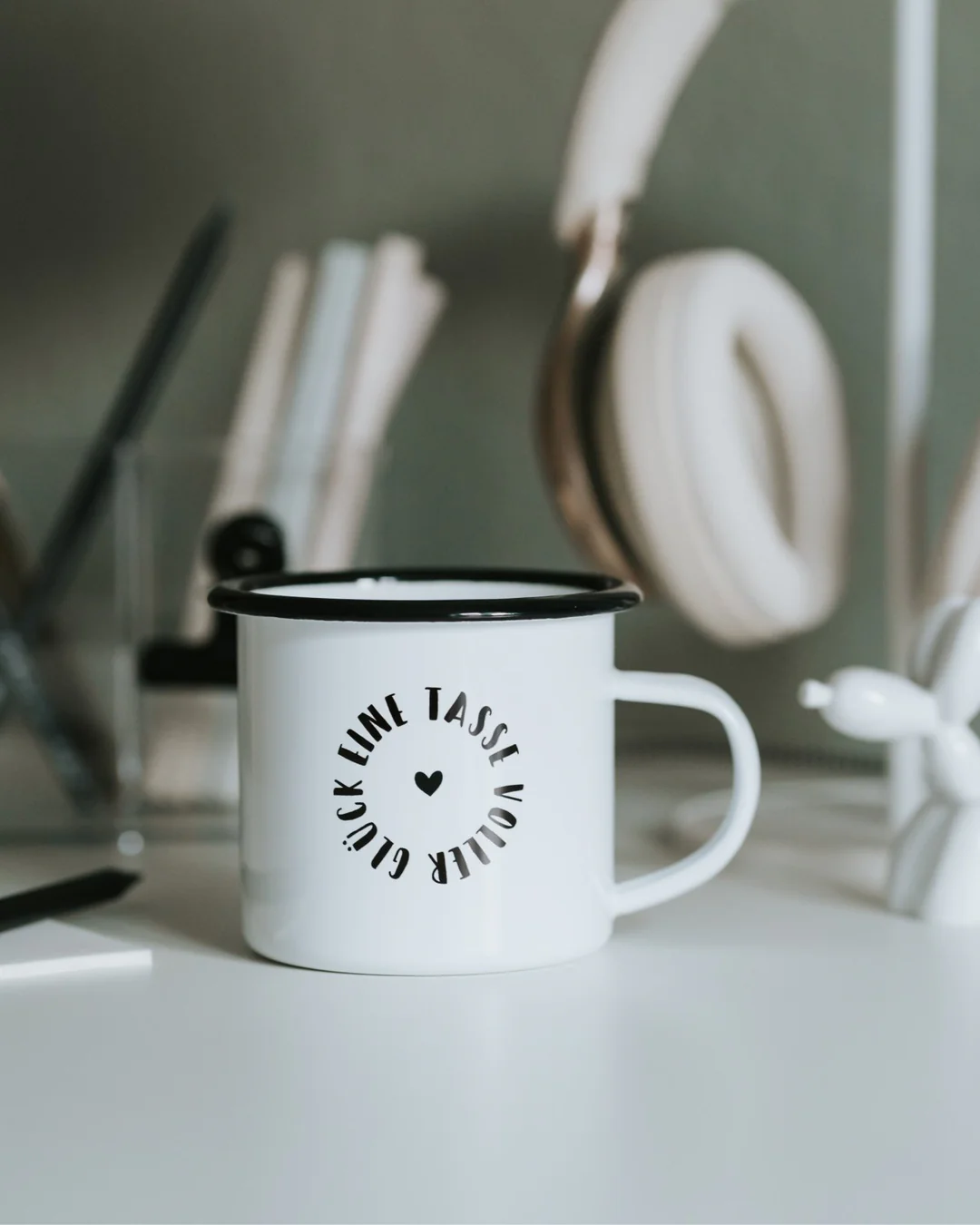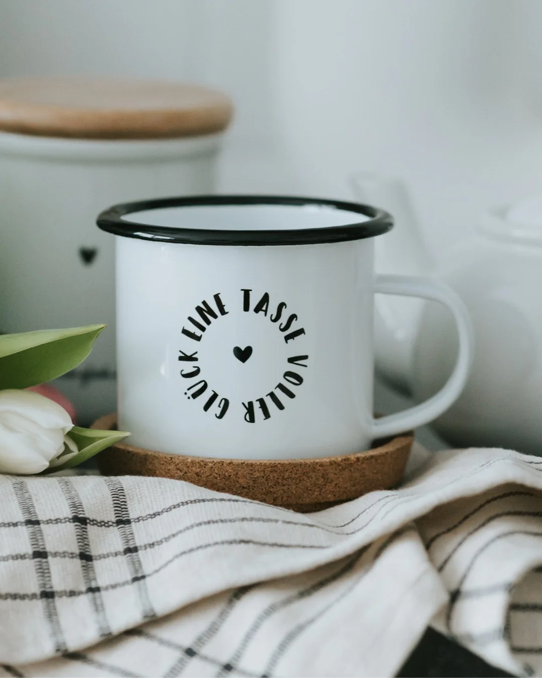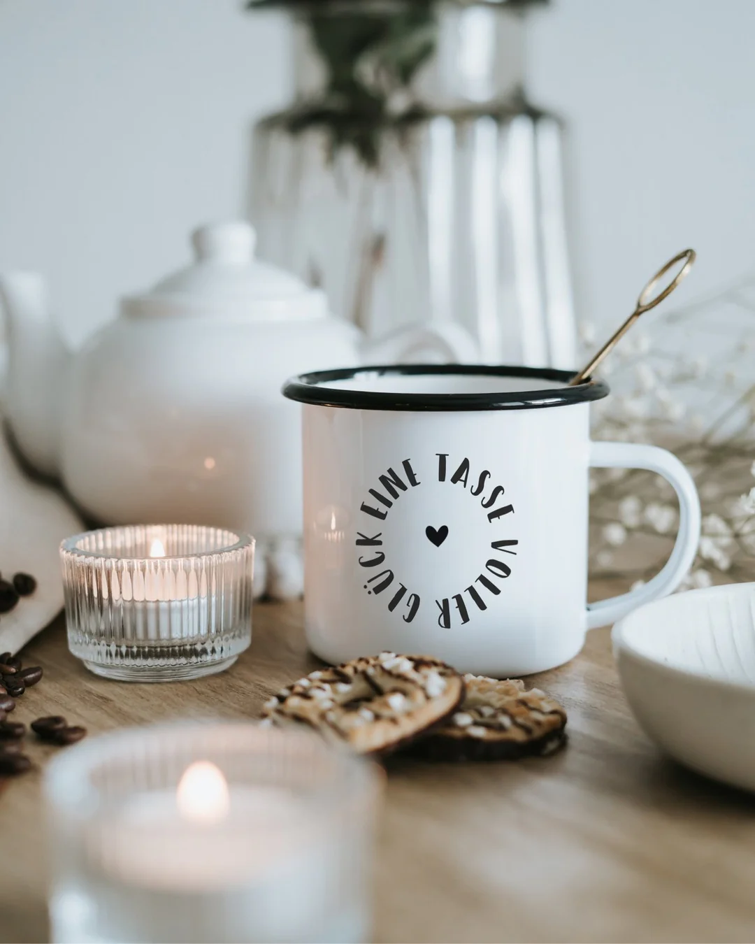 Unsere stilvolle Emaille-Tasse mit dem Schriftzug „Eine Tasse voller Glück“ ist mehr als ein Alltagsgegenstand – sie bringt Freude in jeden Moment.