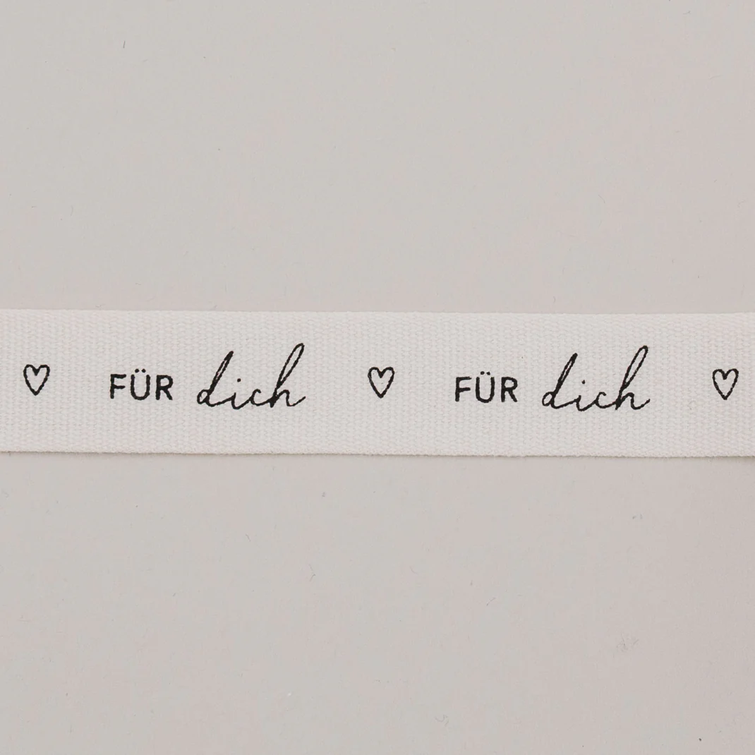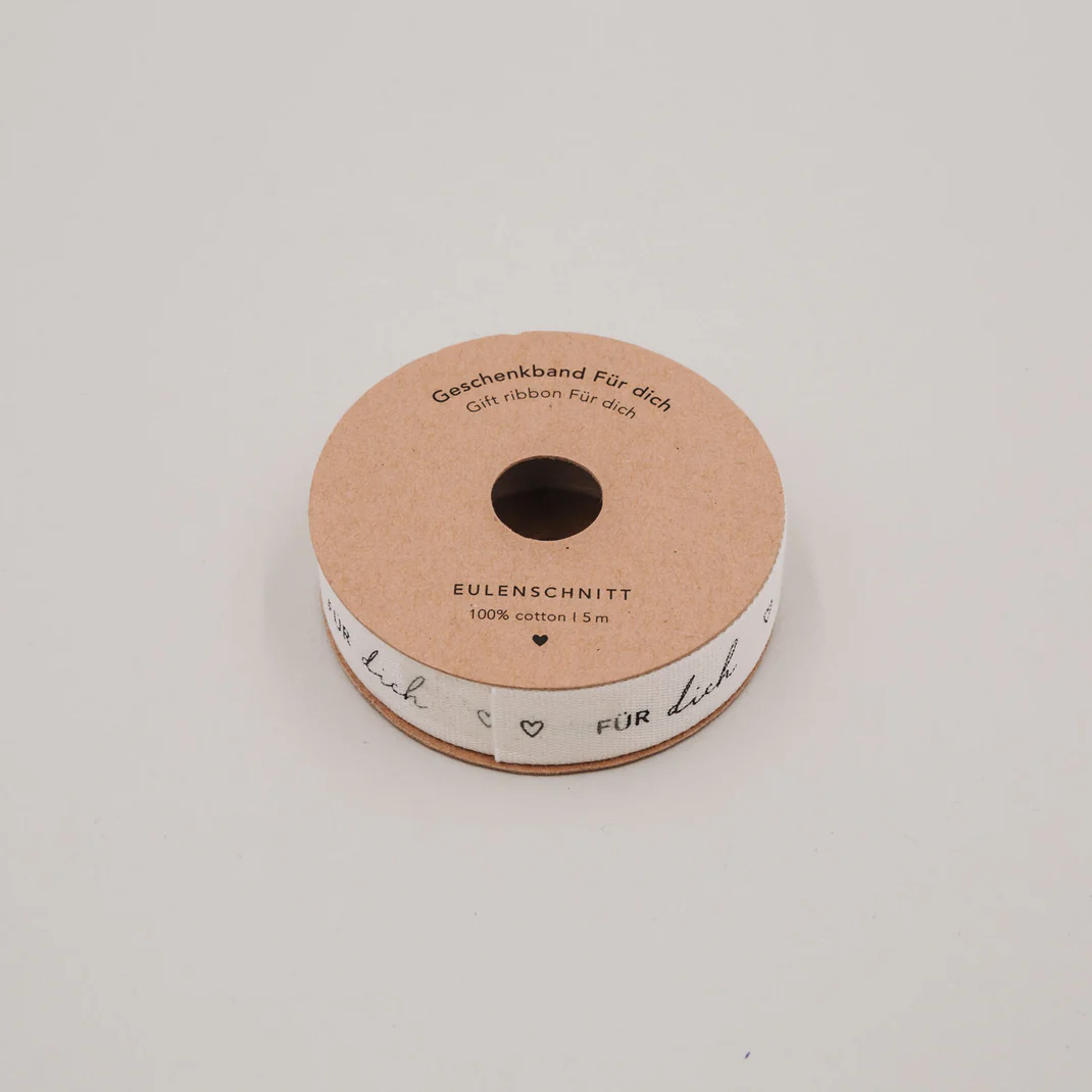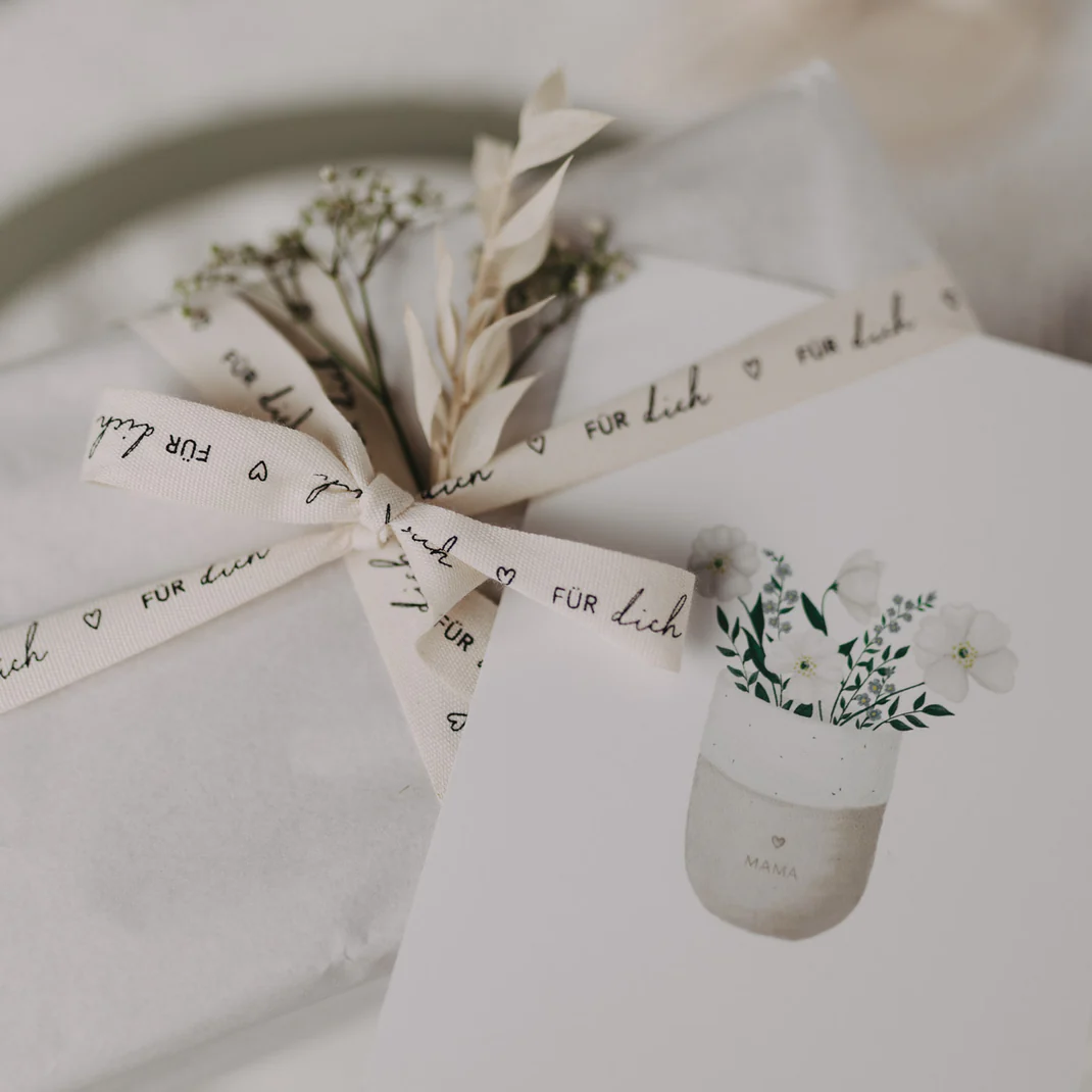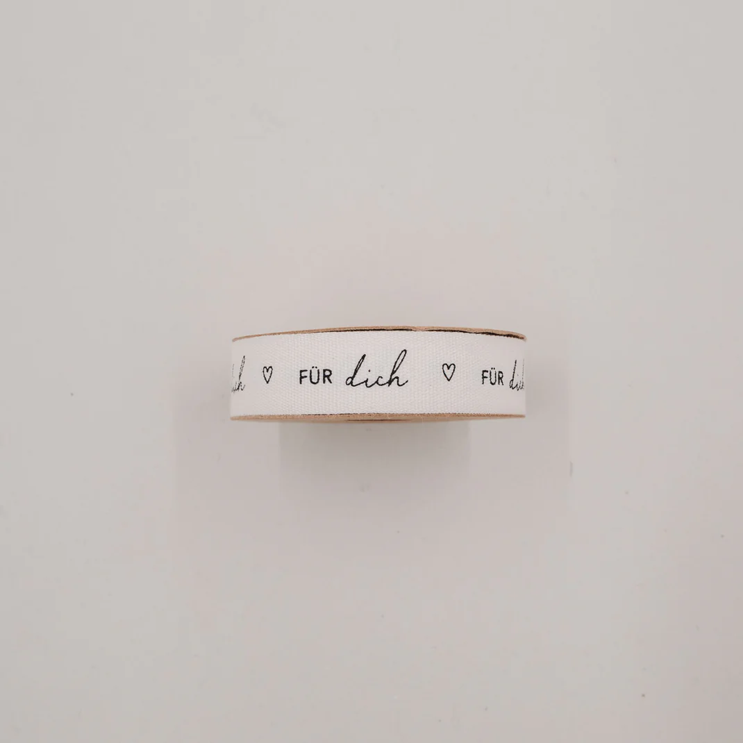 Das feine beige Band ziert der schwarze Schriftzug „Für dich“, der dezent und doch ausdrucksstark deine Botschaft unterstreicht. Ob für Geschenke, zum Dekorieren oder Basteln – dieses Band bringt Natürlichkeit und Herz in jedes Detail.