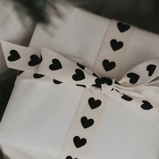 Mit unserem Geschenkband Herzen wird jedes Präsent zum Blickfang! Das 5 m lange Band aus hochwertiger Baumwolle liegt angenehm in der Hand und verleiht jedem Geschenk das gewisse Etwas. Die zarten schwarzen Herzen auf beigen Grund sorgen für einen liebevollen, natürlichen Look – perfekt für Geburtstage, Hochzeiten oder Weihnachten.