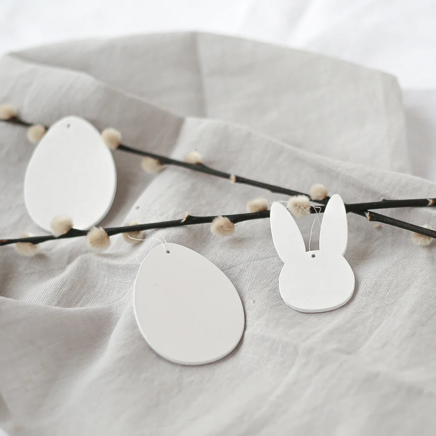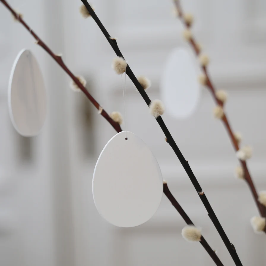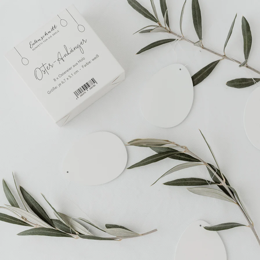 Hast du Lust auf Osterdekoration – dann werden dir unsere Holzanhänger Eier richtig gut gefallen! Ihr schlichtes, zeitloses aber dennoch verspieltes Design sprechen nicht nur Kinder an. Gern können unsere lasergecutteten Holzänhänger auch noch beschrieben oder bemalt werden. Mit einem Kreidestift kann man sie auch mehrfach bemalen & einfach abspülen. Ausserdem ist in jedem der kleinen Anhänger ein Loch eingefräst, sodass ein beliebiges Band durchgezogen werden kann. Ein dünnes weißes Garn findest Du in jeder Verpackung zu den Anhängern dazu, sodass Du mit dem Aufhängen sofort loslegen kannst. Eine wundervolle Osterdekoration, welche Du ganz nach Belieben individuell dekorieren kannst.