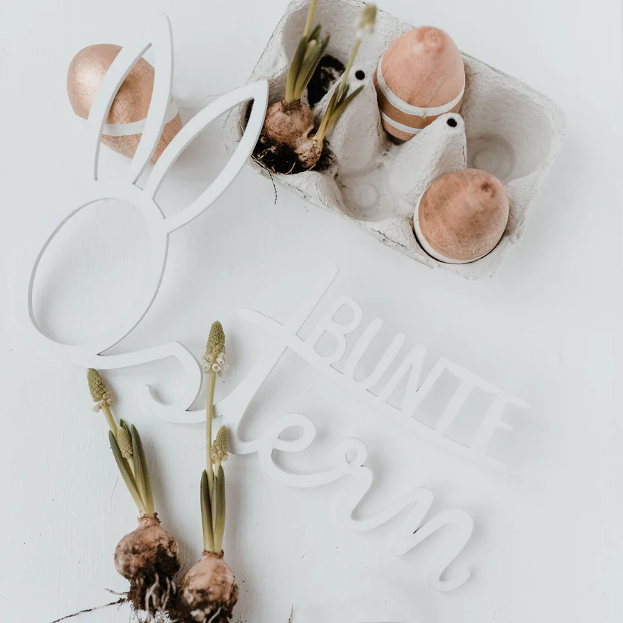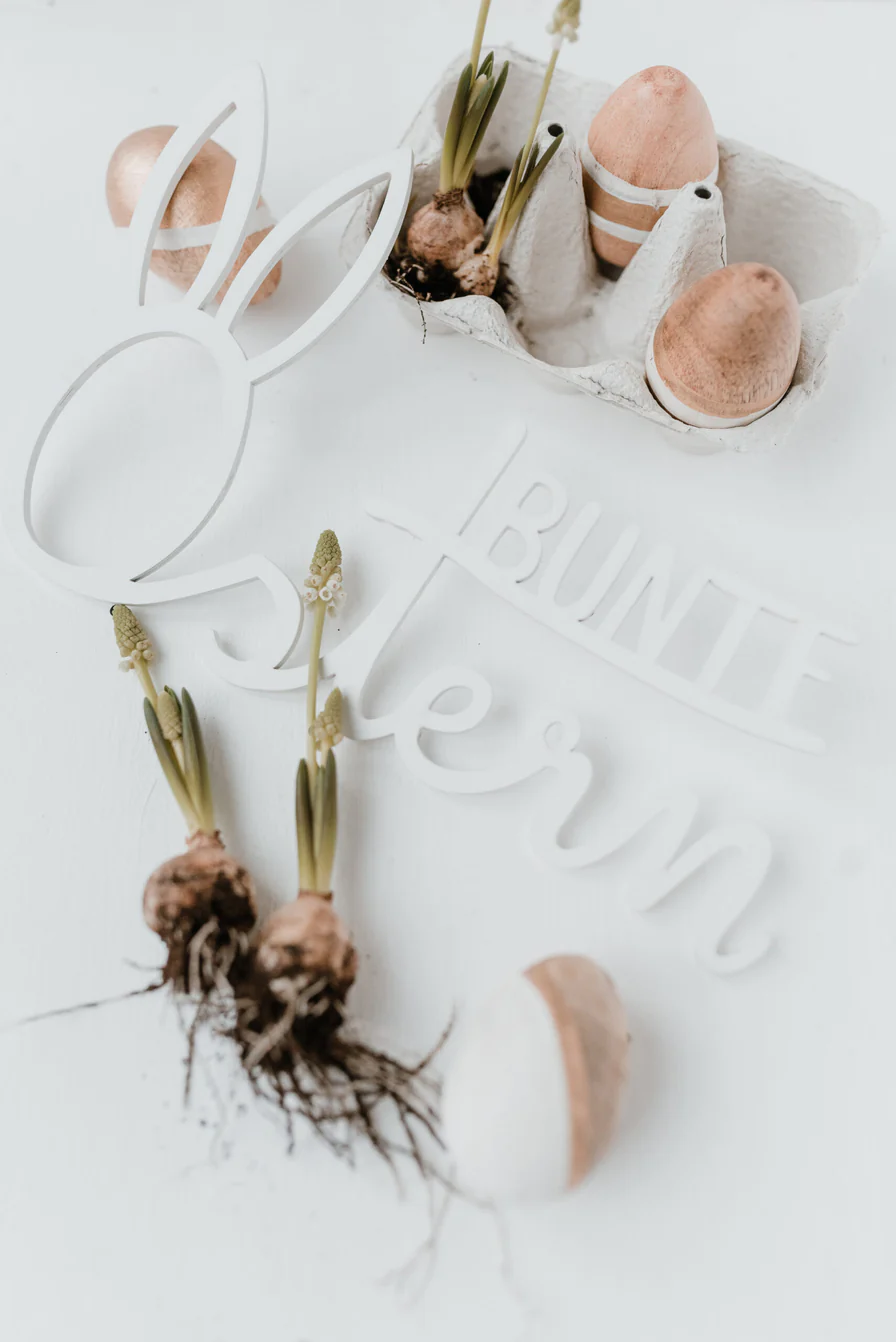 Hast du Lust auf minimalistisch schöne Dekoration – dann wird Dir unser Schriftzug Bunte Ostern richtig gut gefallen! Das schlichte und zeitlose Design passt super in jeden Raum und macht sich auch im Eingangsbereich, als Tischdekoration oder als Geschenk super. Dekoriert mit ein bisschen Eukalyptus oder tollen Trockenblumen zaubert unser Holzschriftzug jedem ein Lächeln ins Gesicht. Eine wundervolle Osterdekoration, welche Du ganz nach Belieben individuell dekorieren kannst.