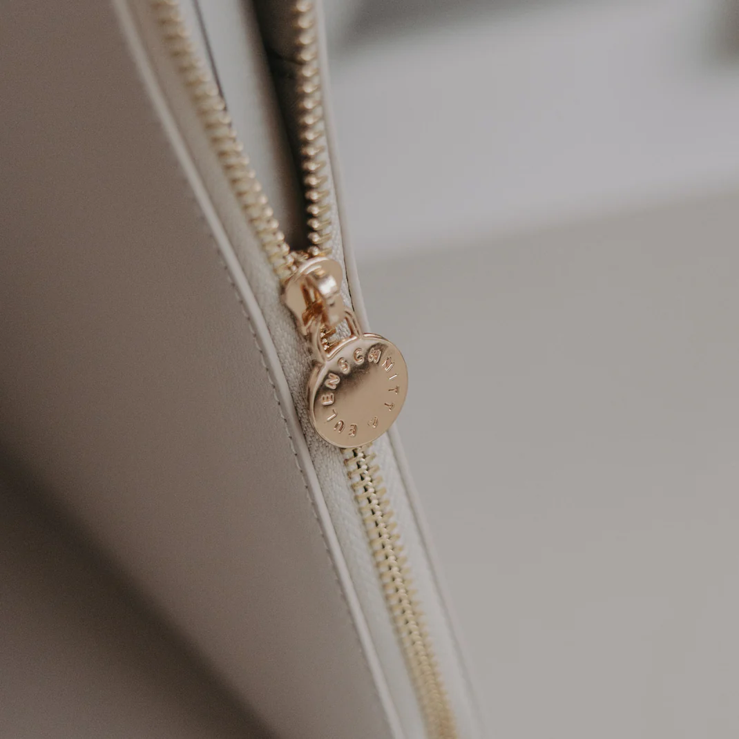 Das sanfte Cremeweiß verleiht der Tasche eine zeitlose, edle Ausstrahlung. Die feine Herzprägung auf der Vorderseite setzt ein dezentes Statement – zurückhaltend und doch voller Gefühl. Ein goldfarbener Reißverschluss sorgt für einen eleganten Akzent, während das dunkelbraune Innenfutter einen warmen, hochwertigen Kontrast schafft.