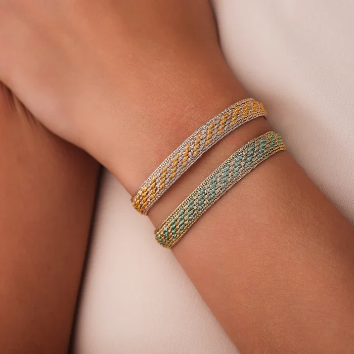Hergestellt aus Goldfäden die man in Marokko „sfifa“ nennt. Traditionell werden die Fäden verwendet, um das marokkanische Kleid, den Kaftan, zu besticken.