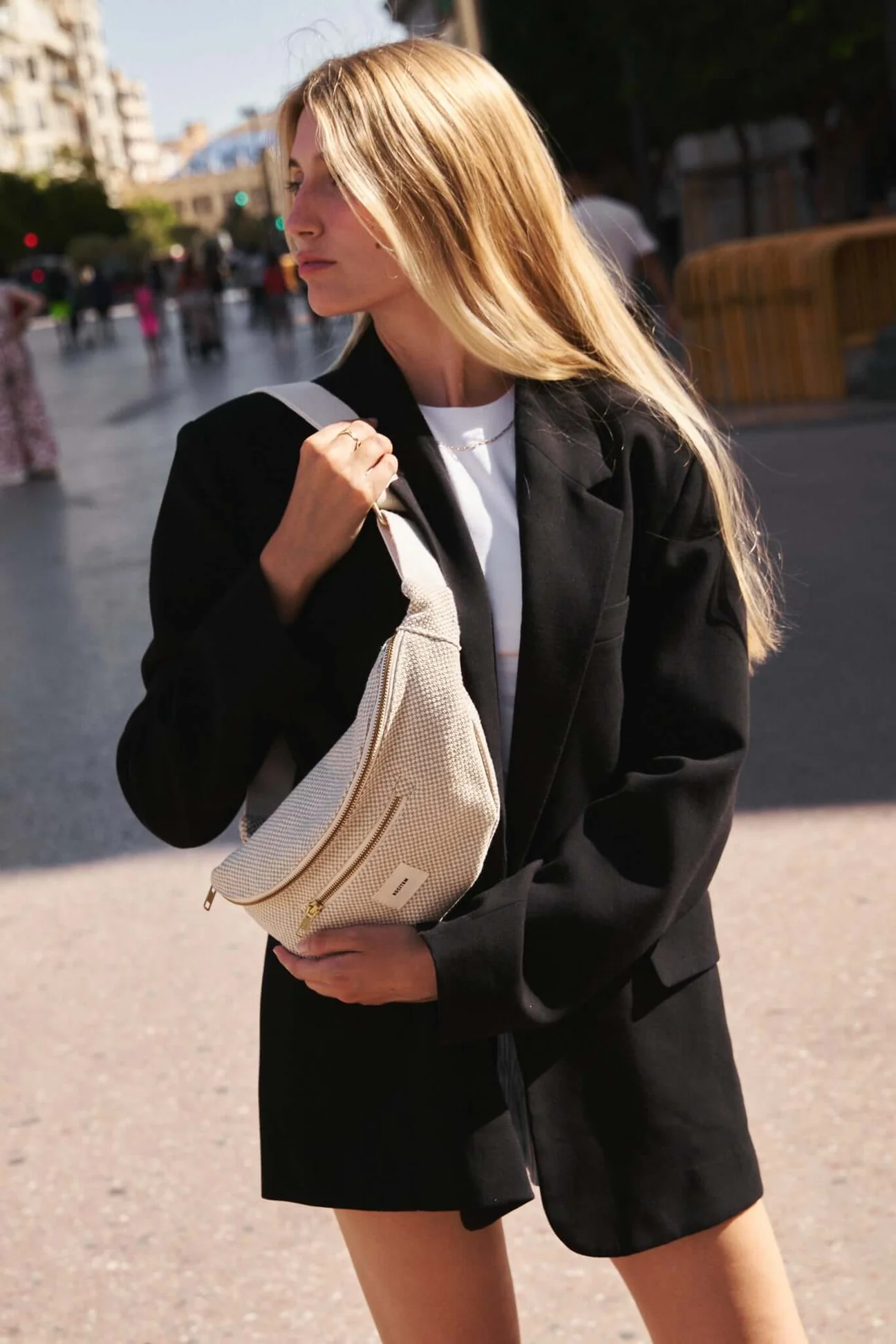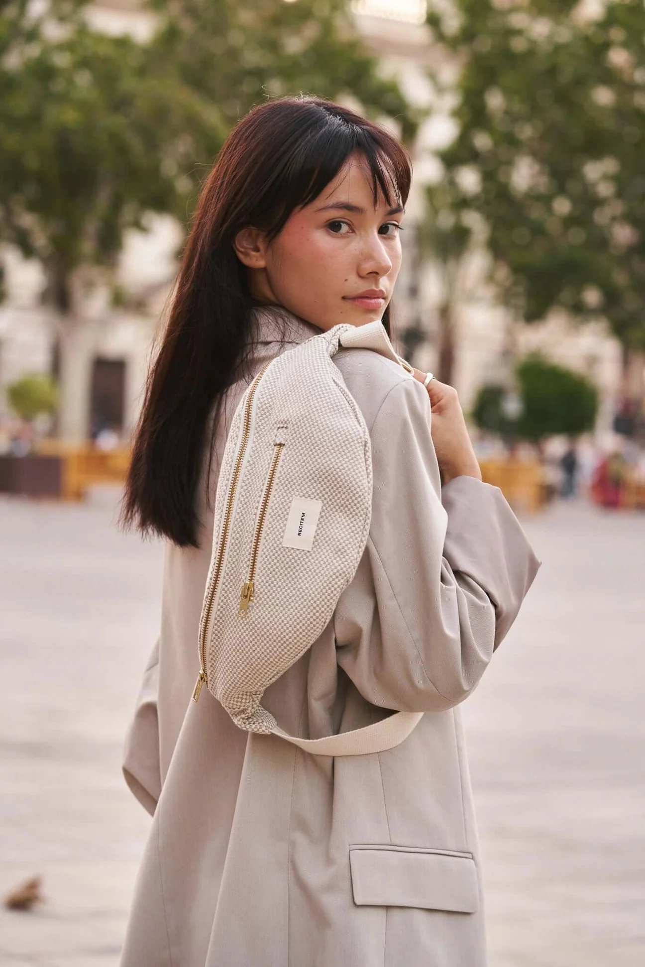 Elio Gürteltasche aus Baumwolle in Beige und Ecru: • Die essentielle, zeitlose Farbe. • Verstellbarer Riemen für jede Körperform und Reißverschlusstasche vorne. • Lokal hergestellt mit kurzen Lieferketten. • Langlebig.