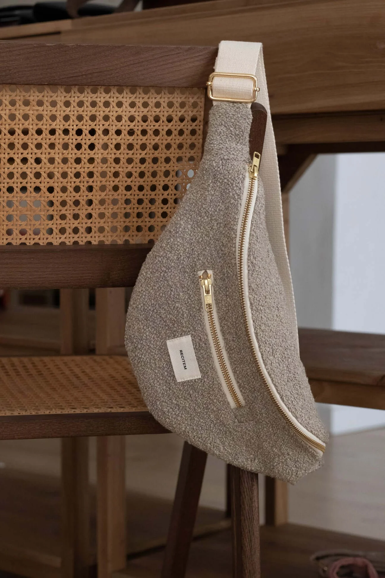 Esra Gürteltasche aus taupefarbenem Bouclé: • Sanfte, neutrale Töne für einen weichen Winterlook. • Verstellbarer Riemen für optimalen Tragekomfort und praktische Reißverschlusstasche vorne . • Das unverzichtbare, zeitlose Accessoire. • Hergestellt in Portugal .