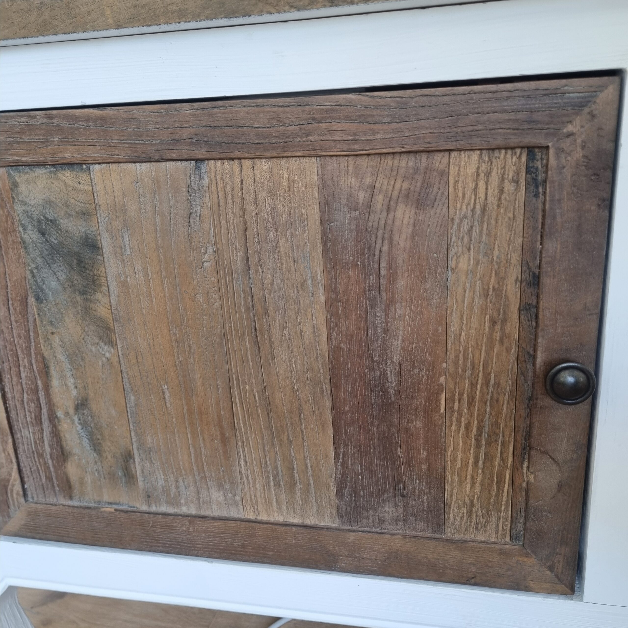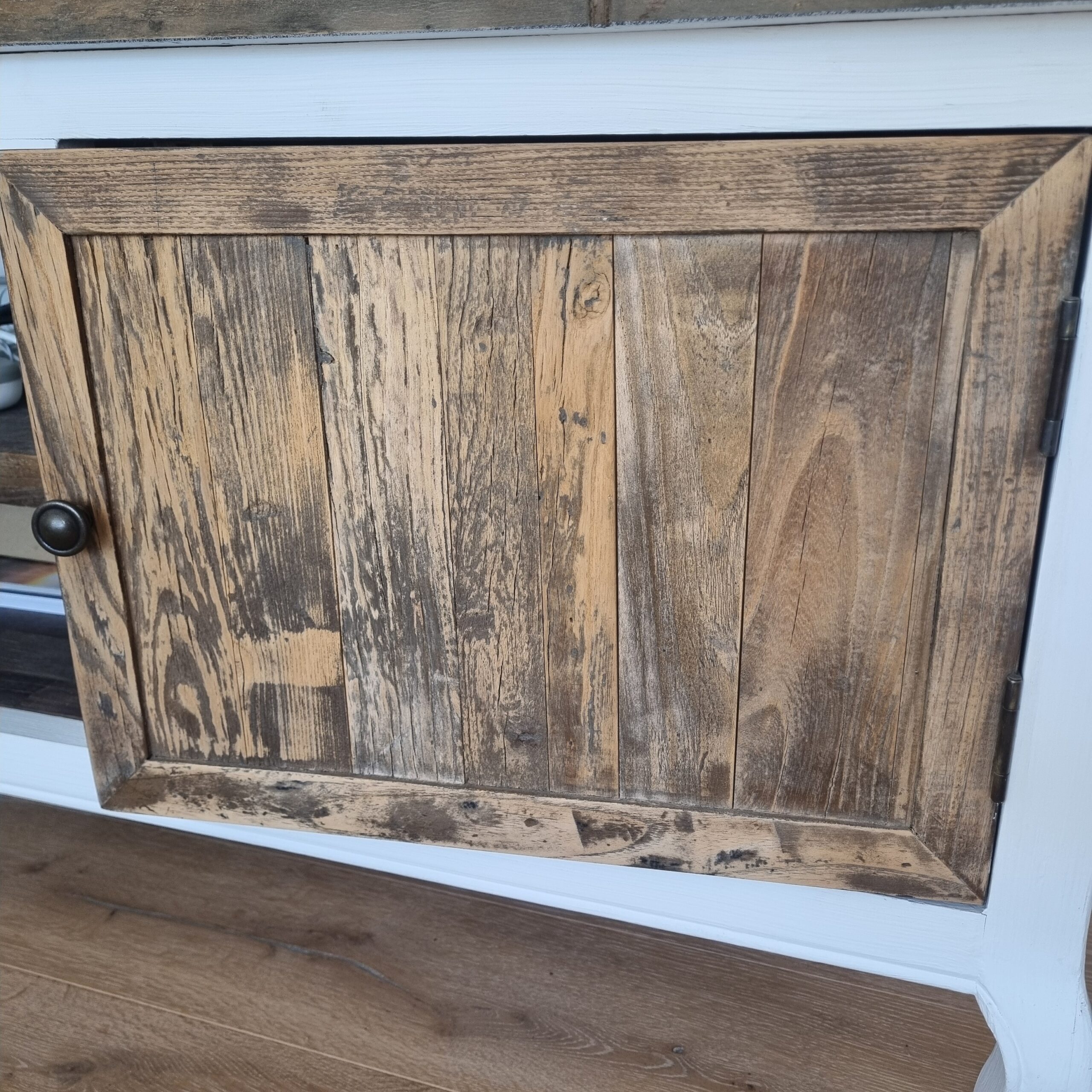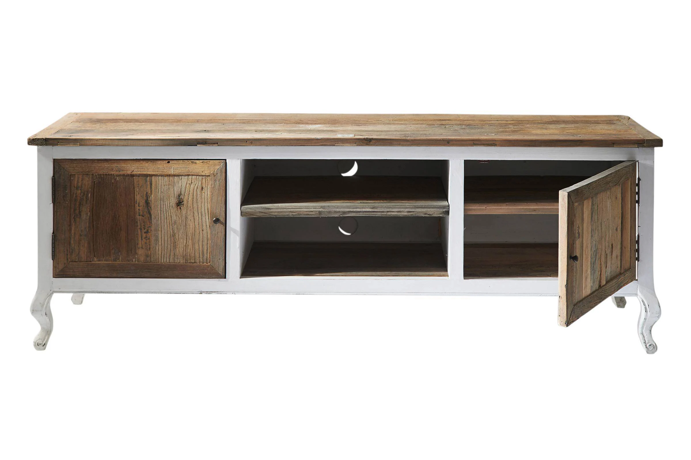 Der perfekte Platz für Ihren Flachbildfernseher. Charmant dank der eleganten Beine und robust durch das Material. Die Tischplatte besteht aus alten Scheunentoren. Dahinter bietet der Schrank Platz für Ihre DVDs oder CDs.