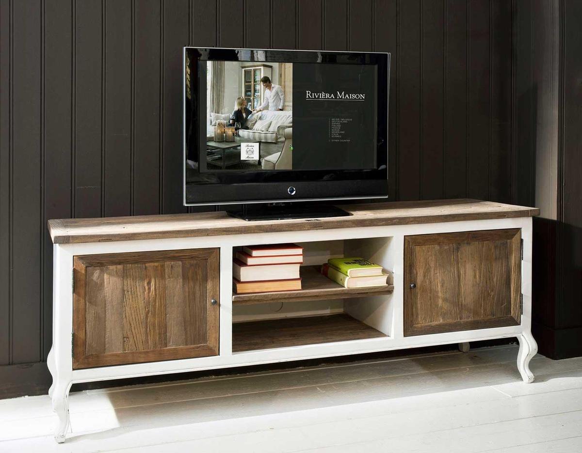 Das TV-Möbel „Driftwood“ stammt von der Marke Rivièra Maison. Der Schrank besticht durch ein Gestell und elegante Beine aus weiß lackiertem Pappelholz. Türen, Regalböden und Deckplatte sind aus alten Ulmen-Scheunentüren gefertigt. Die beiden Türen sind mit Metallknöpfen versehen. Maße (H x B x T): 65 x 180 x 45 cm.