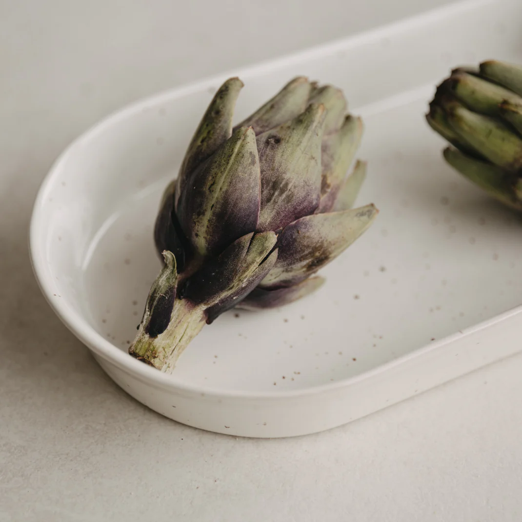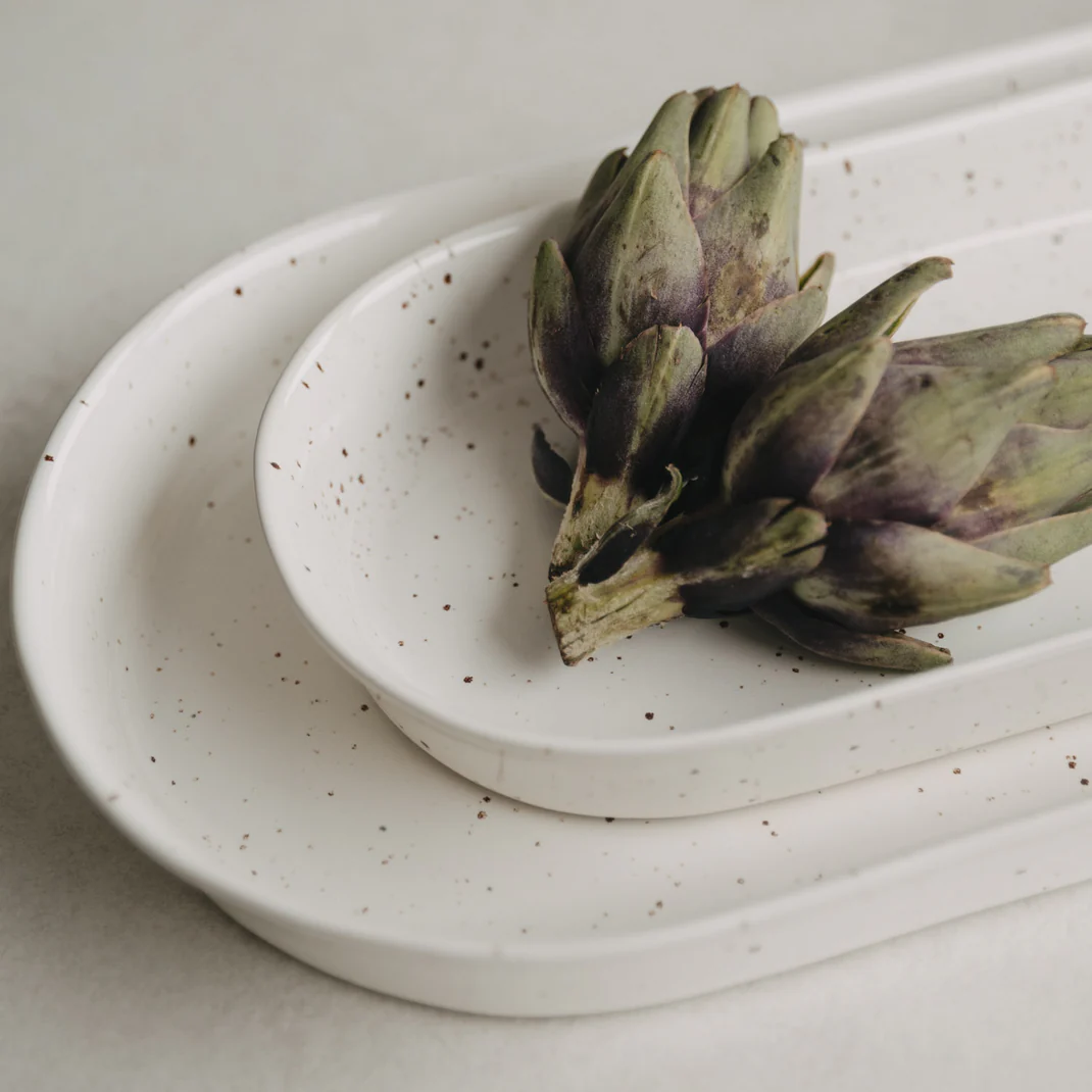 Mit ihrer natürlichen Form, dem dezenten Sprenkel-Look und dem schlichten Design fügt sie sich harmonisch in jede Tischdekoration ein. Wir sind schon ganz gespannt, wie du die Servierschale Calma in deinem Zuhause zum Einsatz bringst!