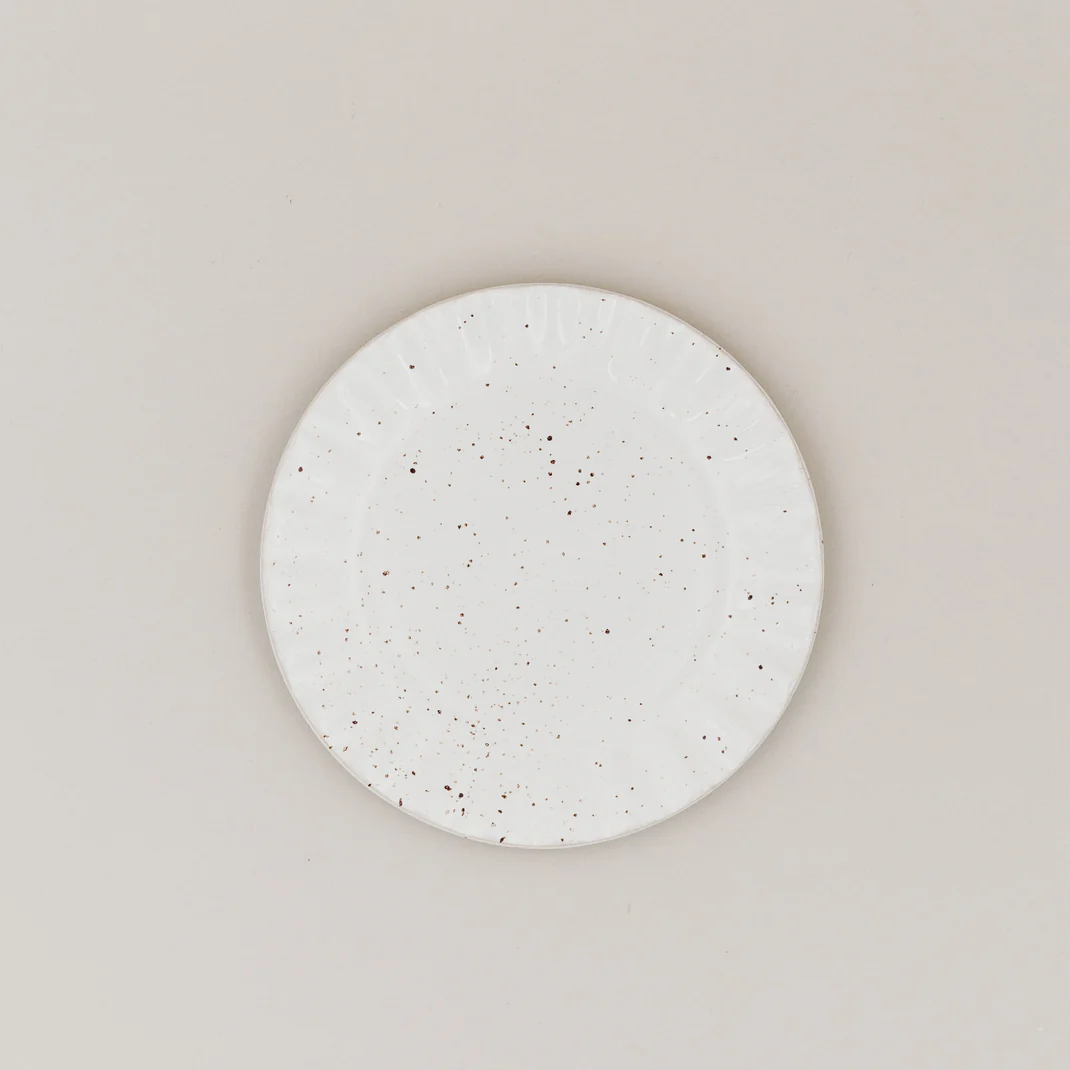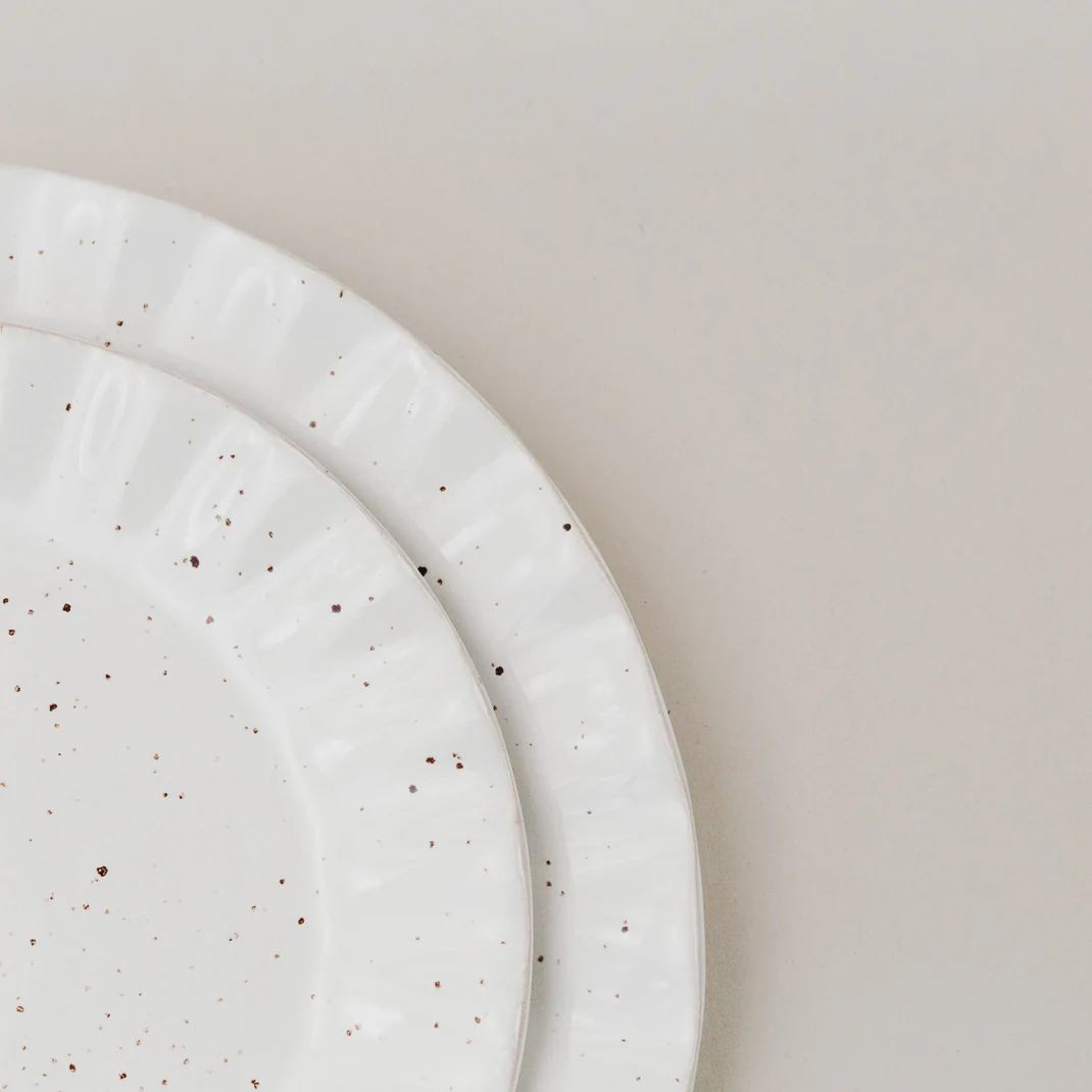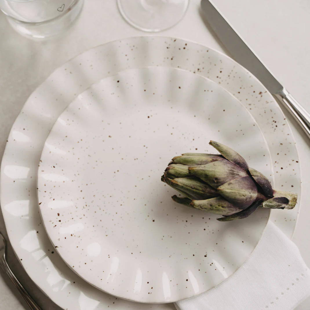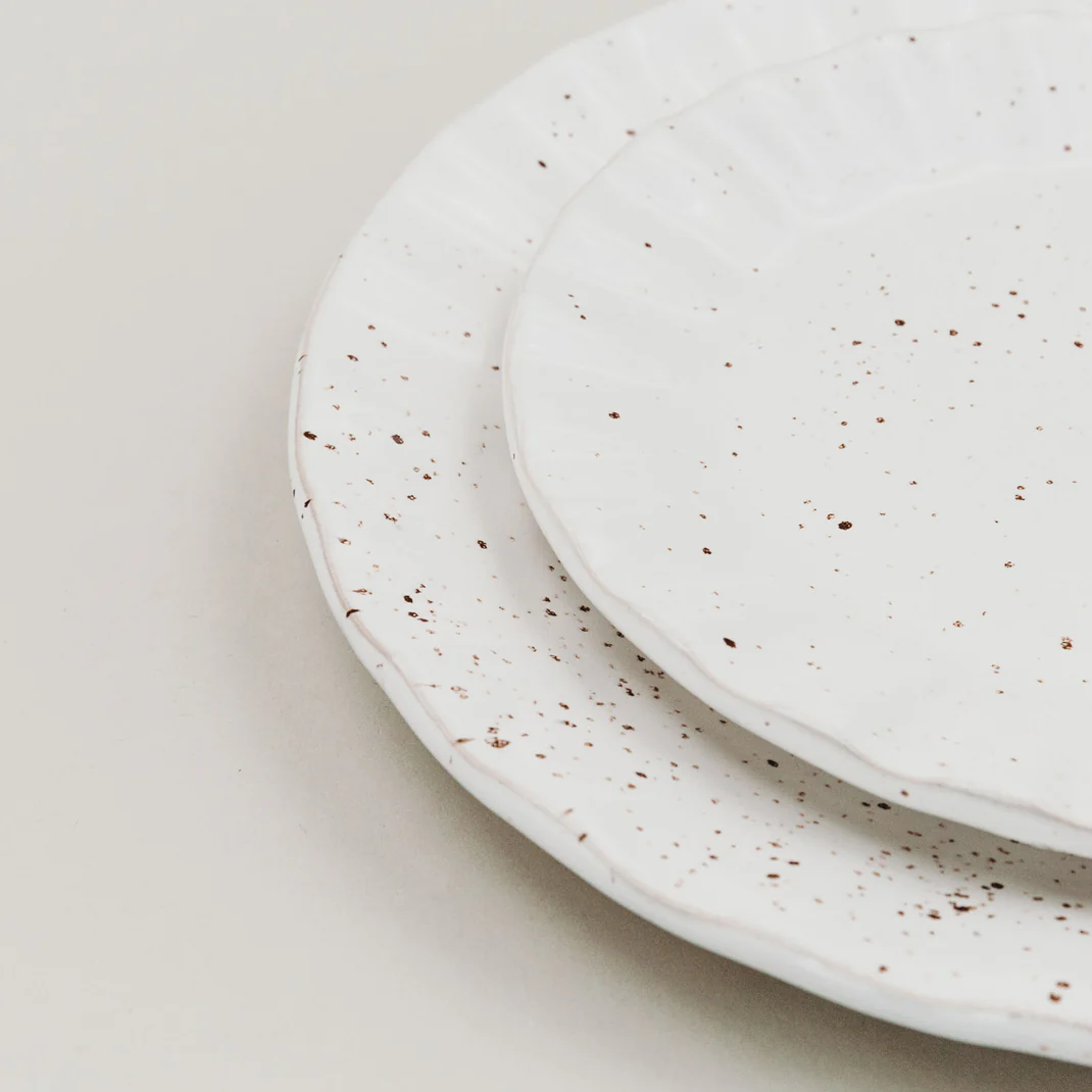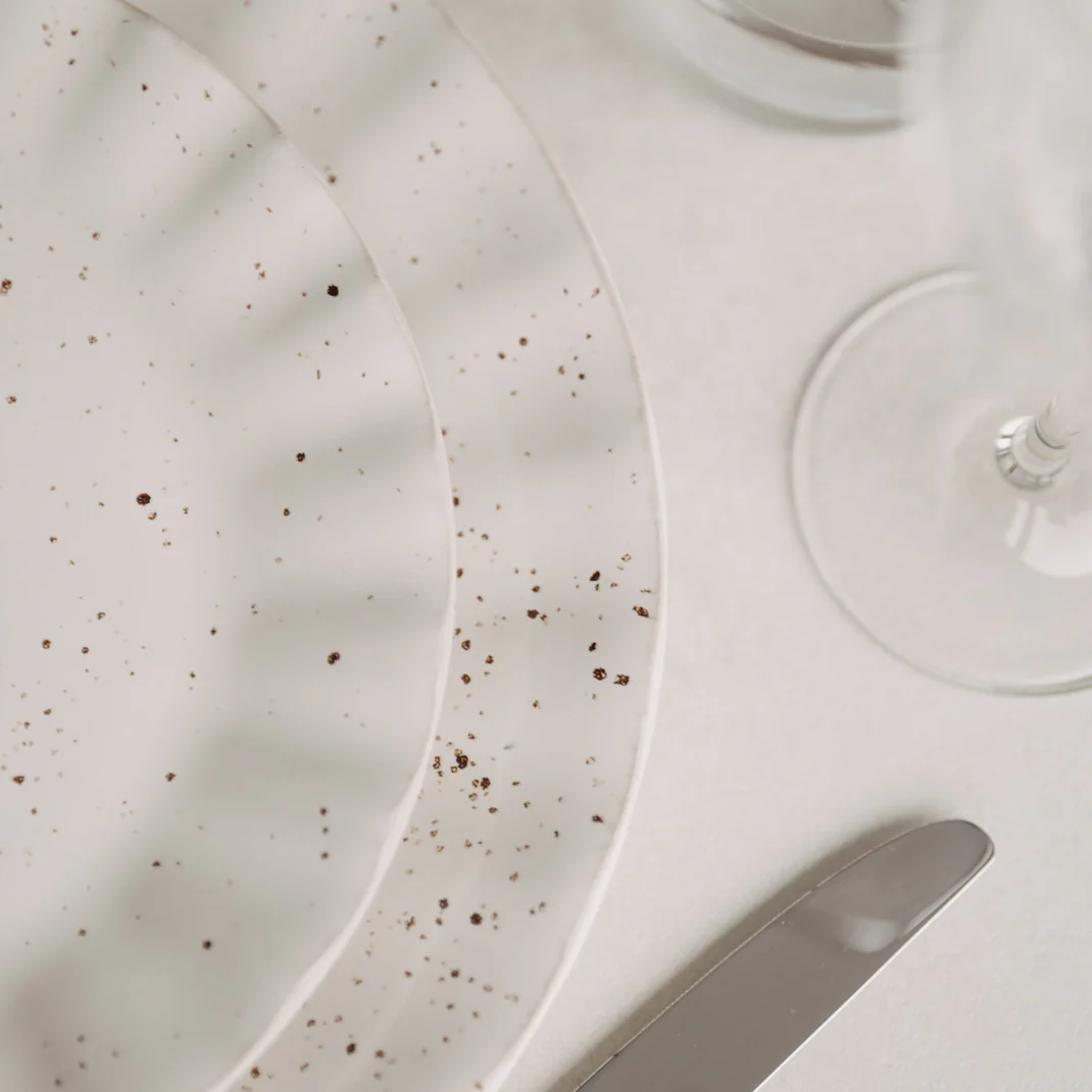 Sein welliger Rand und die feine gesprenkelte Glasur verleihen ihm eine besondere Leichtigkeit – und machen jedes Gericht zu einem kleinen Highlight. Dank der dezenten Farbgebung lässt er sich wunderbar mit anderem Geschirr kombinieren und passt sich deinem Tisch perfekt an.
