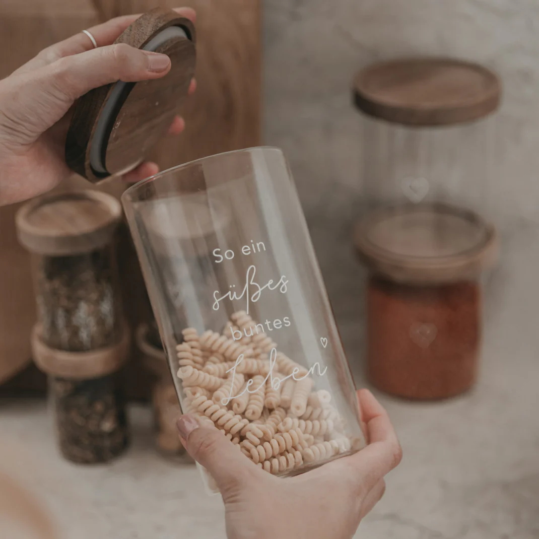 Entdecke unser wunderschönes und praktisches Vorratsglas so ein süsses buntes Leben 19 cm aus Borosilikatglas mit Akazienholz Deckel.