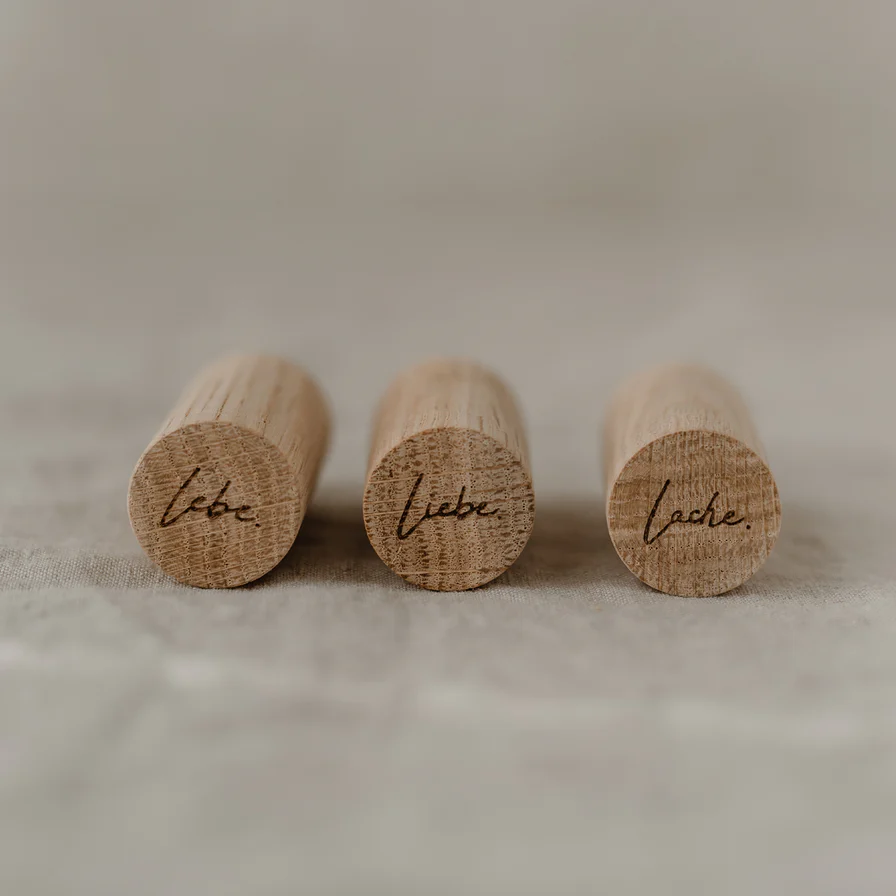 Das Besondere an unseren Wandhaken sind die liebevoll designten Lasergravuren auf der Vorderseite. Dieses Set besteht aus den Wandhaken Lebe, Liebe & Lache. Ganz besonders schön im Eingangsbereich, im Badezimmer, in der Küche oder aber auch im Schlafzimmer. Unsere Wandhaken bringen in jeden Raum das gewisse Etwas. Alle Wandhaken sind aus Eichenholz gefertigt. Sie haben einen Durchmesser von 2,5 cm und eine Länge von 5 cm.